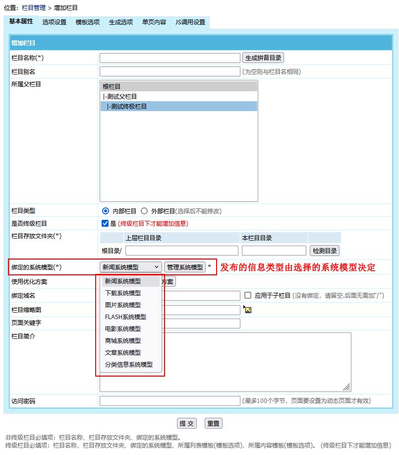 三、增加信息页面发布的信息类型由栏目绑定的系统模型决定:
