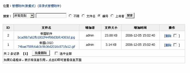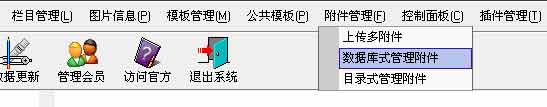 1、登陆后台-》“附件管理”-》“数据库式管理附件”或“目录式管理附件”,如下图: