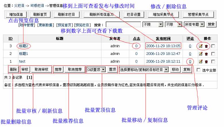 说明:点击“ID”、“点击”、“发布时间”、“评论”可按相应的字段排序。只显示专题的信息,选择“所属专题”然后点搜索即可列表所有这个专题的信息。