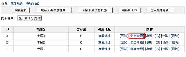| 1、登陆后台-》“栏目管理”-》“管理专题”-》然后点“组合专题”,如下图: |