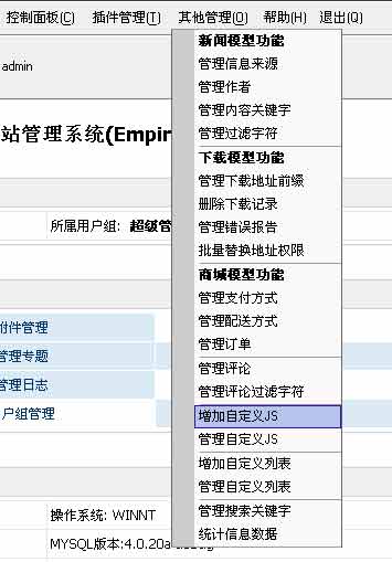 | 1、登陆后台-》“其他管理”-》“增加自定义JS”或“管理自定义JS”,如下图: |