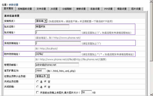 | 设置“站点名称”、“站点地址”、“系统安装地址”、“附件存放地址”后点设置即可。 |