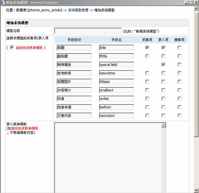 录入数据的表单模板,增加模型时请留空。(如选择“自动生成表单模板”,不用填模板内容,由系统自己生成)