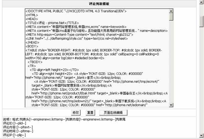 4、修改评论列表模板后,复制页面的代码到后台的“评论列表模板”文本框,然后点击“修改”即可修改完毕。