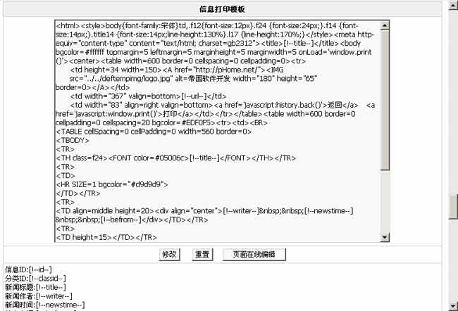 4、修改打印模板后,复制页面的代码到后台的“打印模板”文本框,然后点击“修改”即可修改完毕。