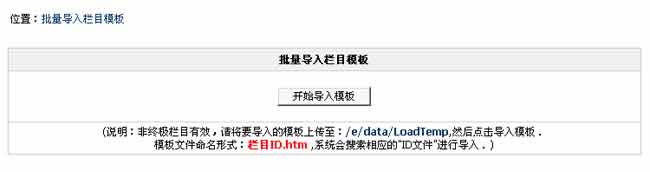 | 1、将要导入的栏目页面模板文件存放到“/e/data/LoadTemp”,文件命名形式:“要导入的栏目的ID.htm”。 |