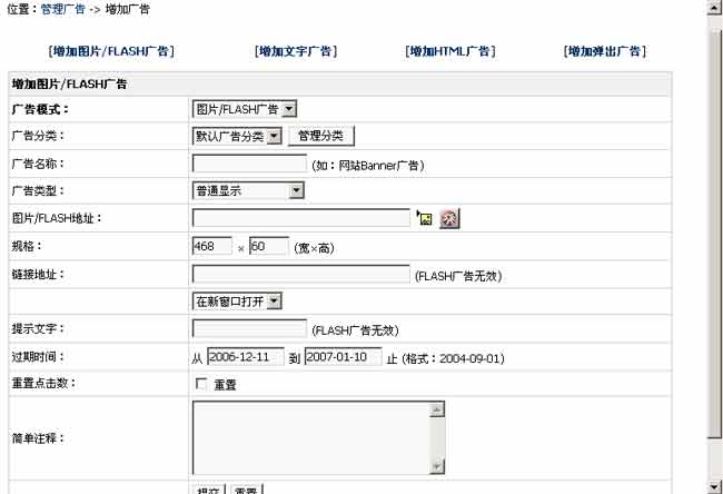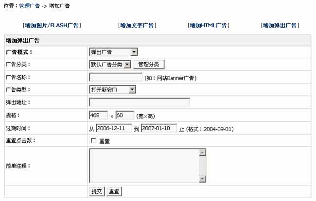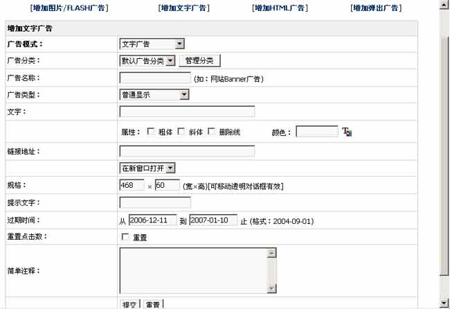 | 系统目前支持四种广告:“图片/FLASH广告”、“文字广告”、“HTML广告”、“弹出广告”。 | ||||||||||||||||||||||