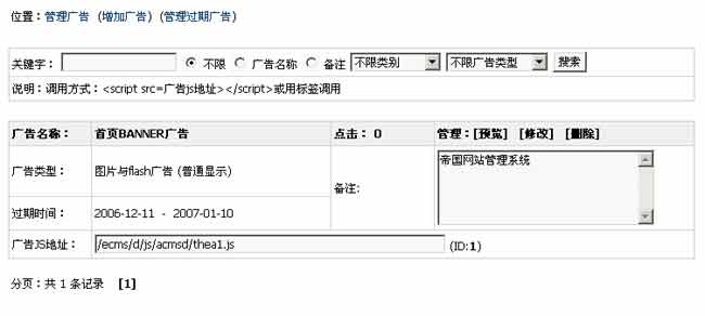 | 说明:广告JS调用方法“<script src=广告JS地址></script>”。管理过期广告可直接到“管理过期广告”。 | ||||||||||||||||||||||