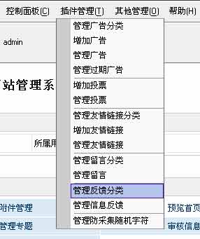 | 1、登陆后台-》“插件管理”-》“管理反馈分类”,如下图: |