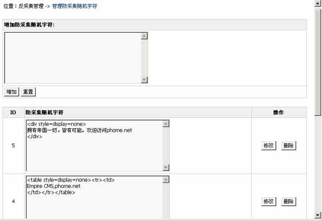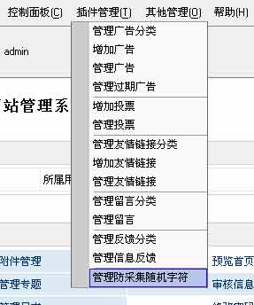 2.增加随机防采集字符:插件管理-》“管理防采集随机字符”(只要字符不显示出来都可以加。字符越多防采的效果越好)