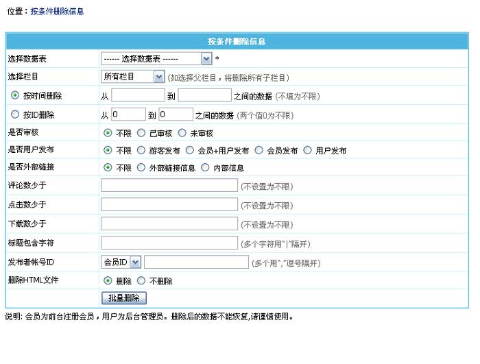 选择是否只删除游客/会员/管理员发布的信息。 |