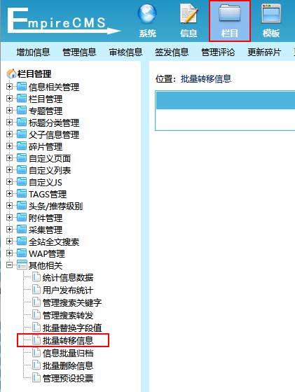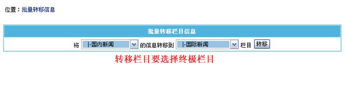 批量转移信息为将某一栏目的所有信息转移到另一个栏目的功能。