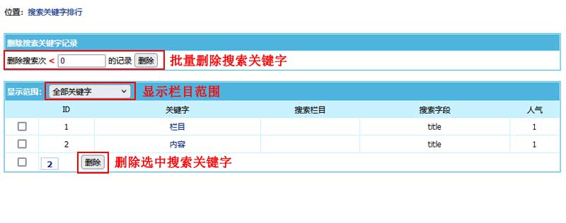 搜索关键字管理为对网站前台搜索关键字记录的管理。