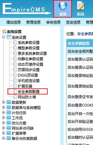 | 一、登录后台,单击“系统”菜单,选择“安全参数配置”子菜单,进入 安全参数配置 界面: |