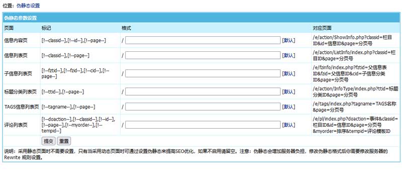 | 说明:伪静态实际是动态,只是伪装成静态地址。服务器上要先设置好转发规则,然后再设置上面格式。修改信息内容页格式后注意要重新更新信息页地址。 |