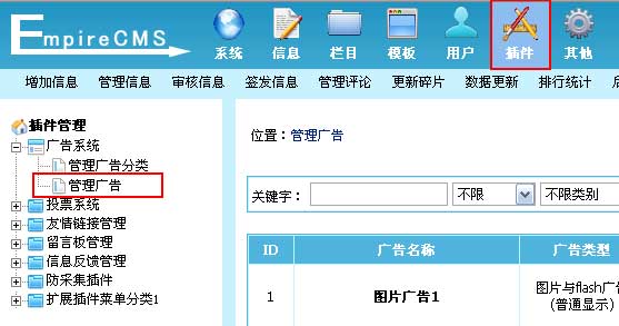 | 1、登录后台,单击“插件”菜单,选择“管理广告”子菜单,进入管理广告界面: | ||||||||||