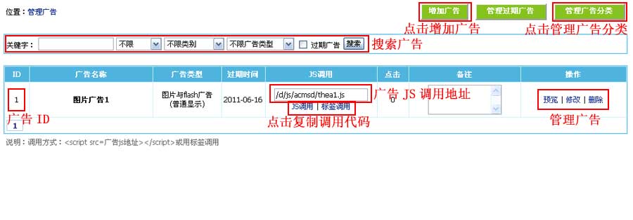 | JS调用广告:<script src="广告JS文件地址"></script>,比如:<script src="http://127.0.0.1/d/js/acmsd/thea1.js"></script> |