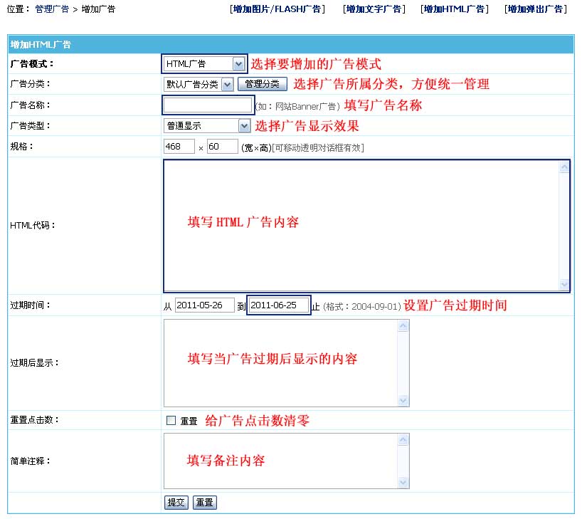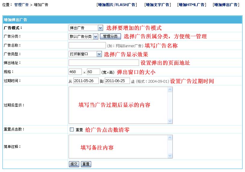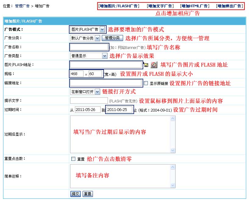 | 增加图片/FLASH广告界面:(其中蓝色条为必填项) | ||||