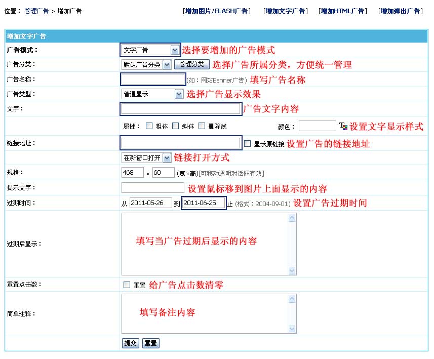 | 增加文字广告界面:(其中蓝色条为必填项) | ||||