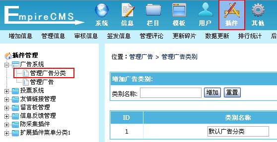 | 1、登录后台,单击“插件”菜单,选择“管理广告分类”子菜单,进入管理广告分类界面: |