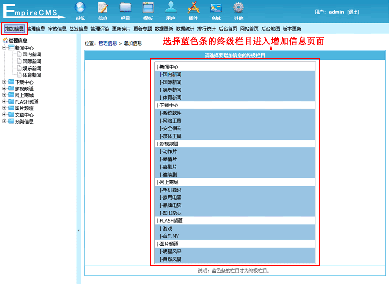 | 1. 单击“增加信息”快捷菜单; 2. 在右侧的栏目选择界面中,点击增加信息的终极栏目; (选择下拉框中的蓝色条,蓝色条代表终极栏目可直接增加信息;白色条代表非终极栏目,不能增加信息) |