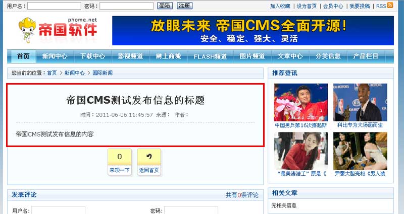 | 上面你可以设置成生成相关页面,这样就不需要手动选择“生成当前栏目、父栏目与首页”下拉框中的内容,单击“提交”按钮,将信息发布到前台。 |