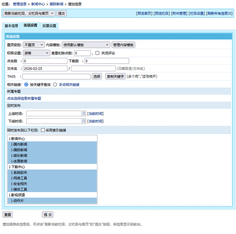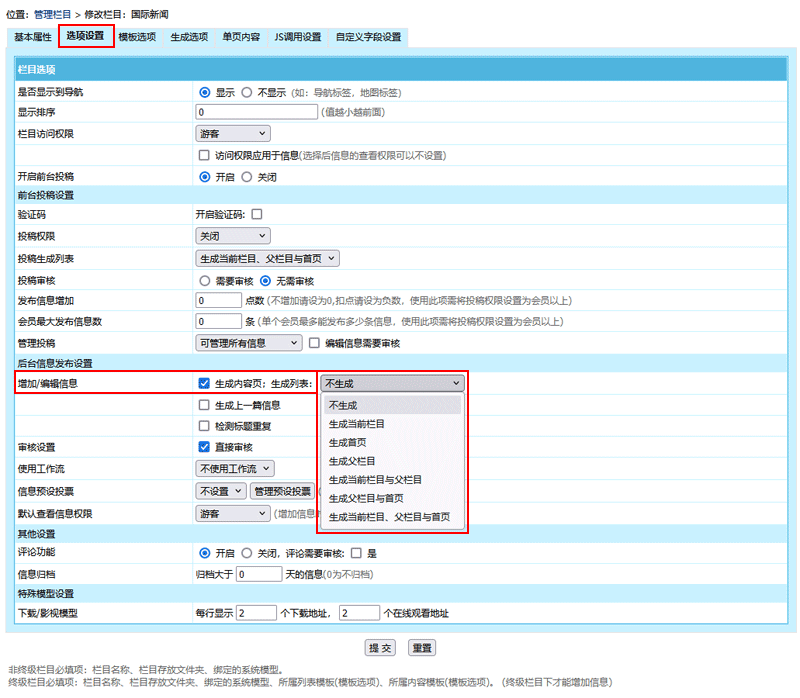 | 增加或修改信息后,将信息发布到前台另一种自动的方法:栏目选项设置里设置增加/修改信息时自动生成相关页面 |
