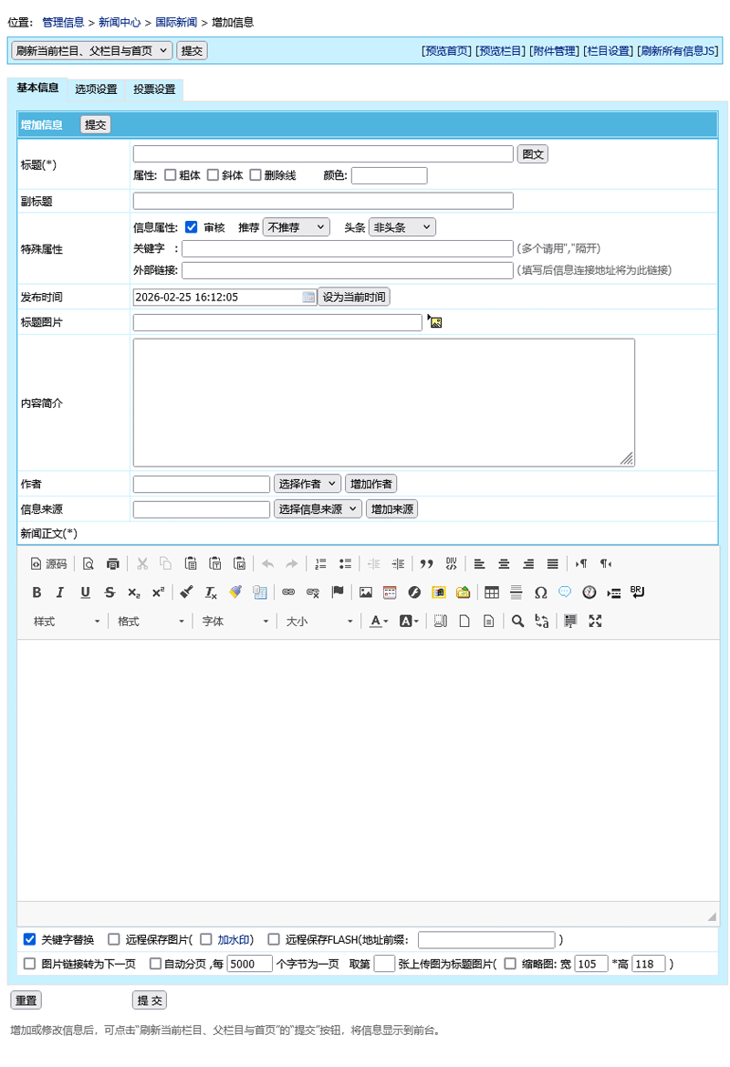 | 1、单击“增加信息”按钮后,出现增加信息界面,如下图:(以新闻模型为例,其它模型可举一反三) |