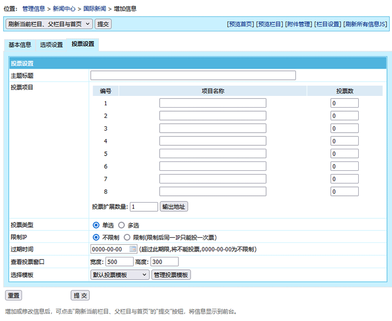 | 设置投票模板后,内容模板需加“[!--info.vote--]”显示信息投票变量才会显示。 |