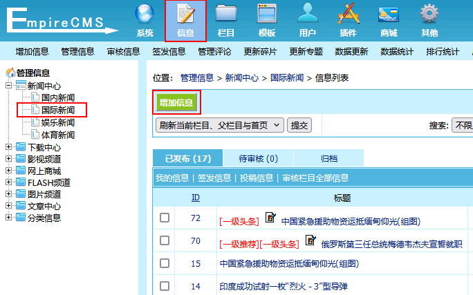 | 1. 单击“信息”菜单; 2. 在左侧的栏目列表界面中,选择需增加信息的终极栏目(如栏目“国际新闻”)并单击; 3. 在右侧的信息列表界面中,单击“增加信息”按钮。 |