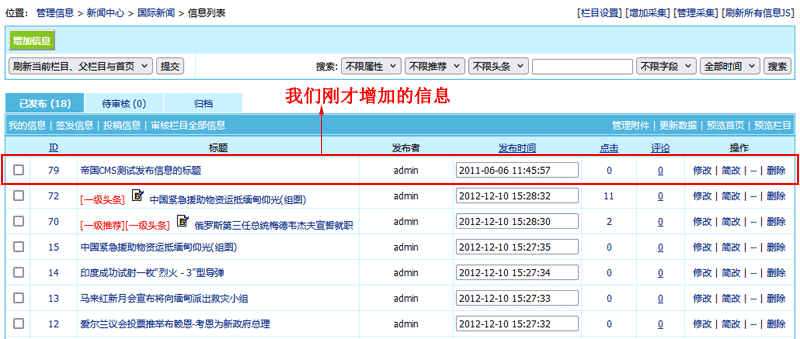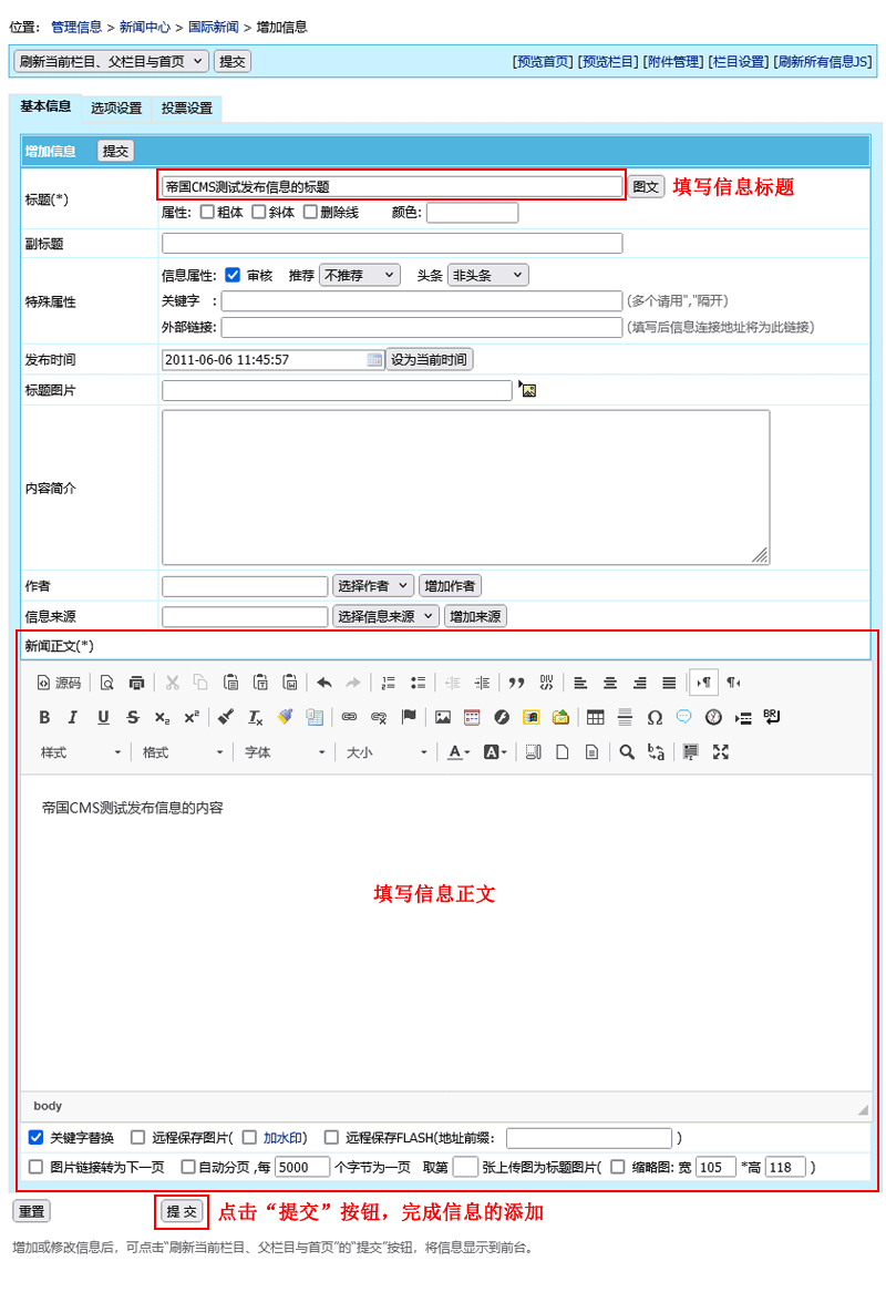 | 1、选择增加信息的终极栏目; 2、进入增加信息页面,填写内容并提交; 3、生成相关页面(将信息发布到前台)。 |