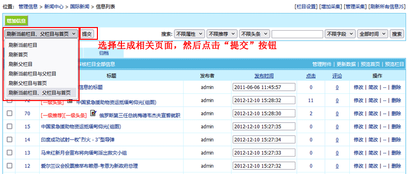 | 1、在信息列表页面,选择“生成当前栏目、父栏目与首页”下拉框中的内容,单击“提交”按钮,将信息发布到前台栏目页、首页(见下图): |