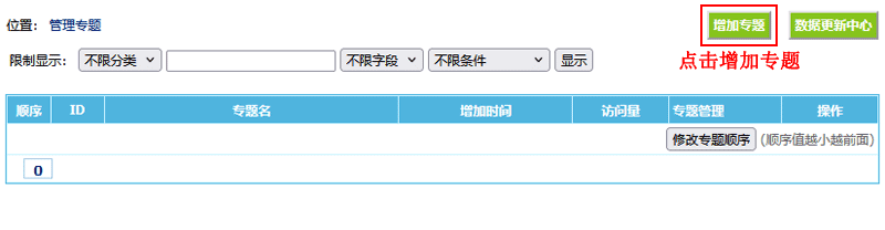 | 专题名称、存放文件夹、页面显示模式、选择所属列表模板为增加专题的必填项设置。 |