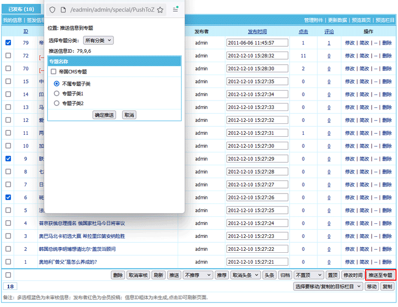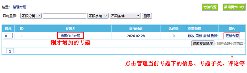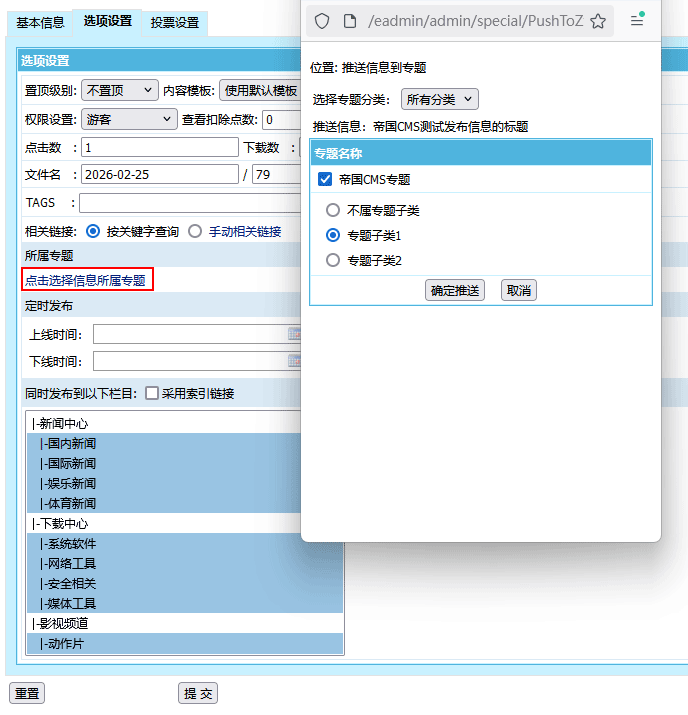 如果指定则只会在该栏目的增加信息时显示专题(信息选项设置中的所属专题选项)。 |