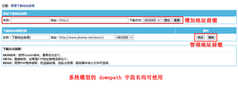 对系统模型“downpath”字段名的下载地址前缀进行管理。