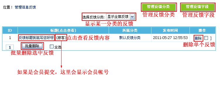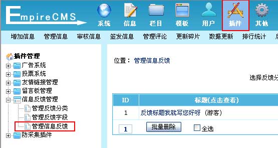 | 1、登录后台,单击“插件”菜单,选择“管理信息反馈”子菜单,进入管理信息反馈界面: | ||||||||||