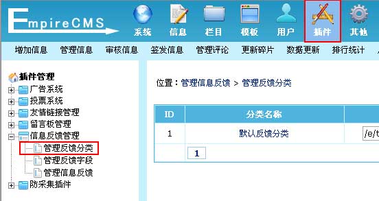 | 1、登录后台,单击“插件”菜单,选择“管理反馈分类”子菜单,进入管理反馈分类界面: | ||||||||||||||