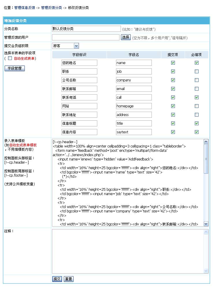 | 增加反馈分类时的反馈表单模板可以任意修改,只要name变量名不变,改成其他表单元素都可以。比如:性别:<input