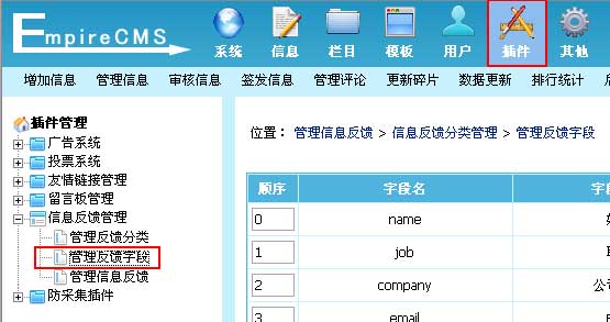 | 1、登录后台,单击“插件”菜单,选择“管理反馈字段”子菜单,进入管理反馈字段界面: | ||||||||||||||||||