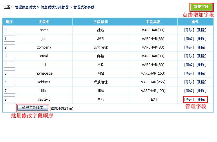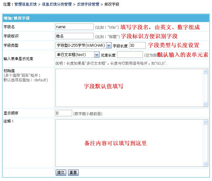 | 四、管理反馈字段:(增加表单录入项) | ||||||||||||||||||