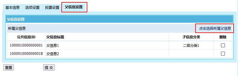1、在管理信息页面,可将某一信息加入父信息,如下图: