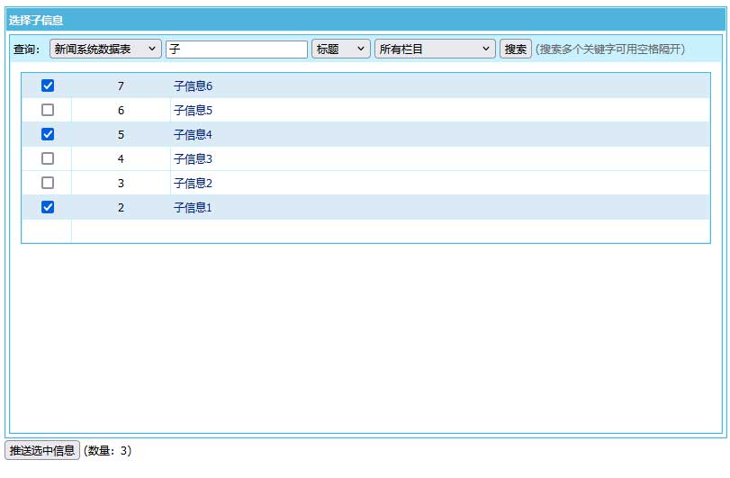 3、除了增加信息页面可以增加子信息外,还可以在管理子信息页面批量推送子信息到父信息里:
