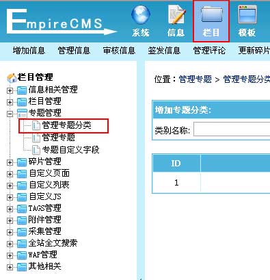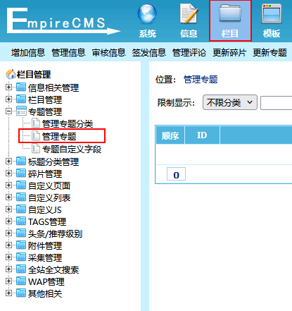 | 1、登录后台,单击“栏目”菜单,选择“管理专题”子菜单,进入管理专题界面: |