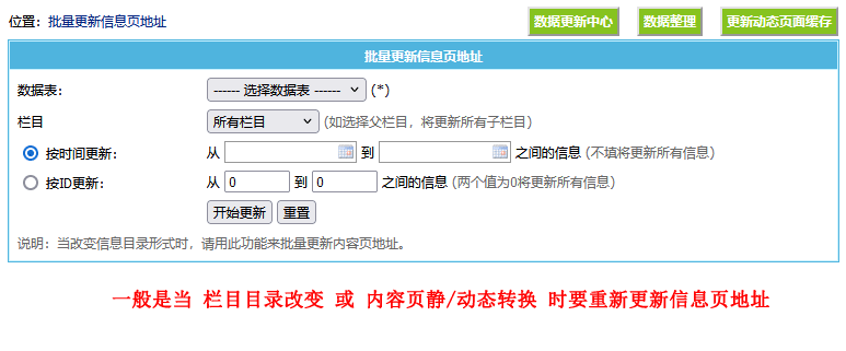 更新“信息ID”在某一ID段的内容页地址(两个值为0将更新所有内容页地址)。