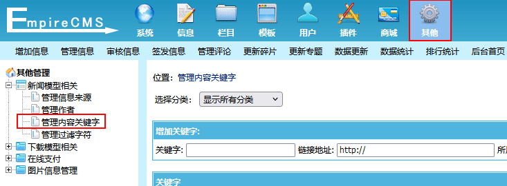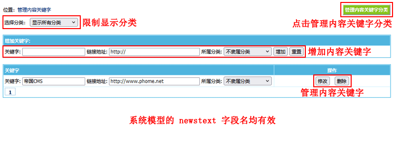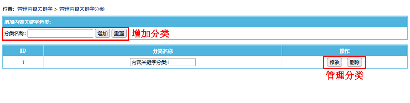 ”子菜单,进入管理内容关键字界面: