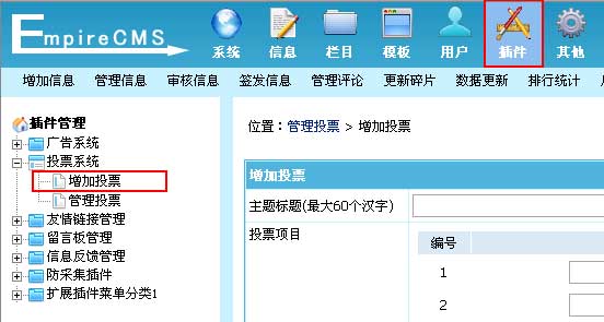 | 1、登录后台,单击“插件”菜单,选择“增加投票”子菜单,进入增加投票界面: | ||||||||||||||||