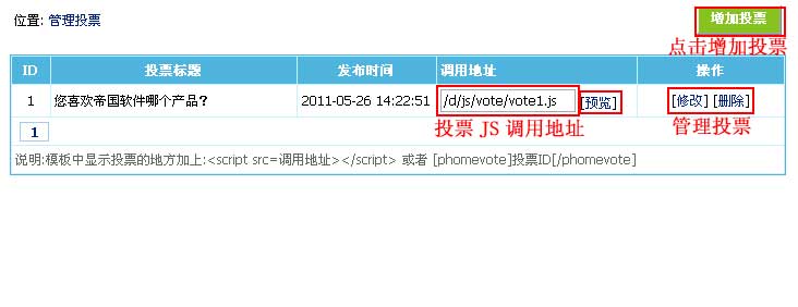 | JS调用投票:<script src="投票JS文件地址"></script>,比如:<script src="http://127.0.0.1/d/js/vote/vote1.js"></script> |