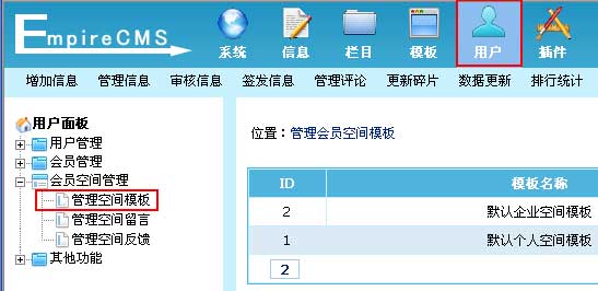 | 1、登录后台,单击“用户”菜单,选择“管理空间模板”子菜单,进入管理空间模板界面: |