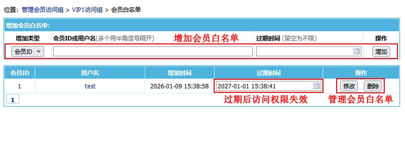 除了可按会员组、会员内部组、会员管理组限制外,还可以按会员白名单、会员白名单有效期进行限制。