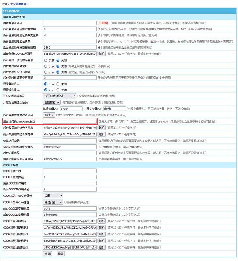 (如果设置错,可通过修改配置文件 /e/config/config.php 的“$ecms_config['esafe']['ckhuseragent']”还原设置)